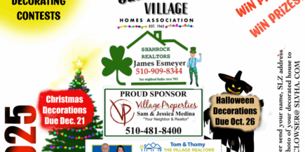 ENTRIES ARE NOW ONLINE! Check them out on the contest page! Judging: Sunday, December 21 Get ready to make the Village sparkle! The annual Christmas Decorating Contest is coming up, and judging will take place on December 21. To participate, email your name, San Lorenzo address, and a photo of your decorated home to mclowser@slvha.com. …