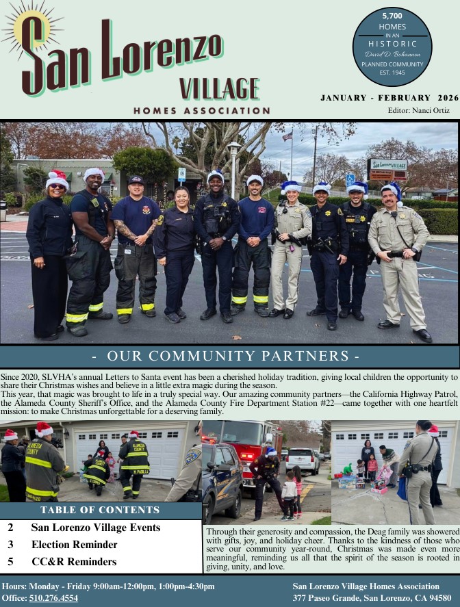 The January-February Village Brief is out! Check out the information and events happening around San Lorenzo Village, important updates from the Homes Association, community news, reminders, and other helpful things to start the new year.